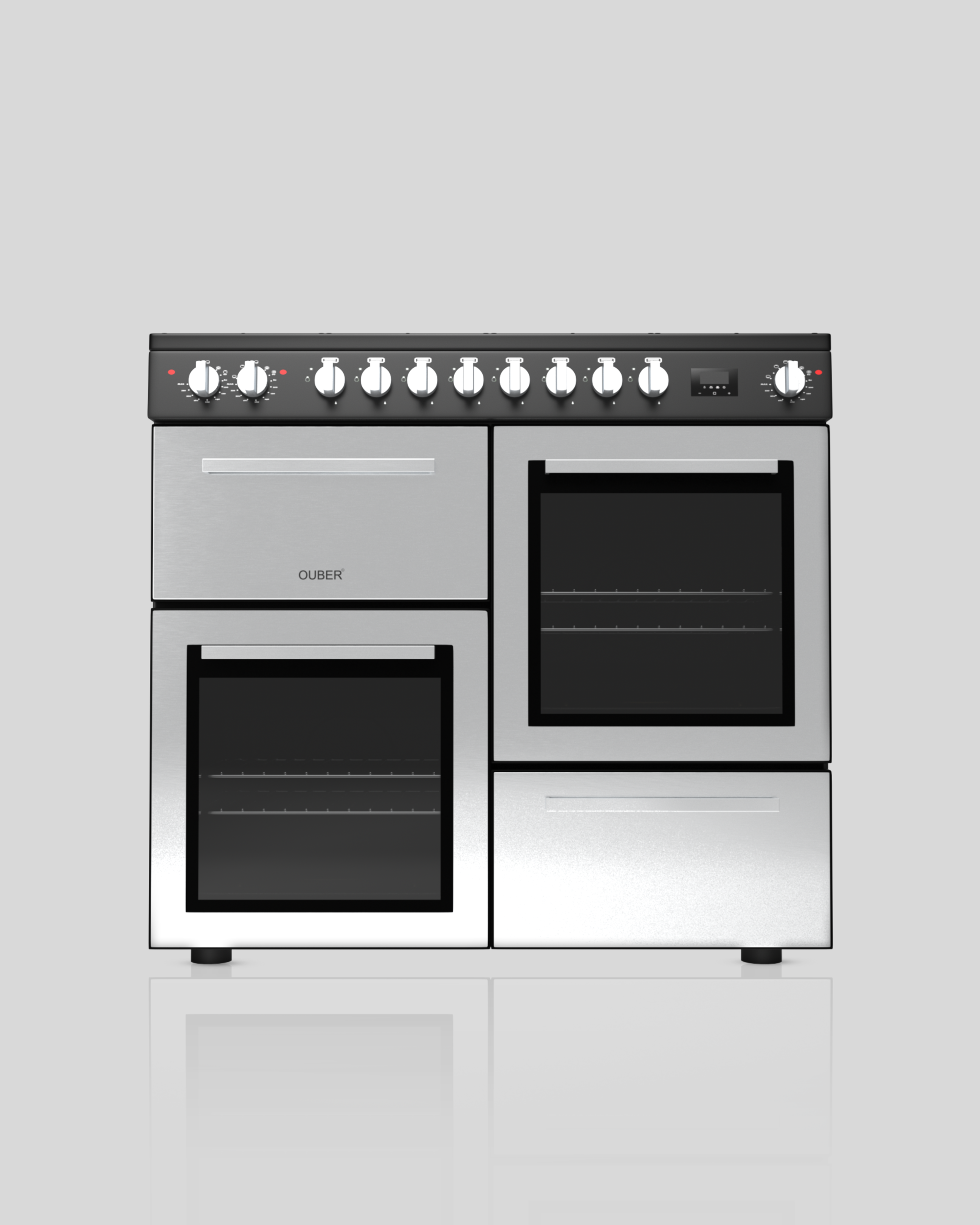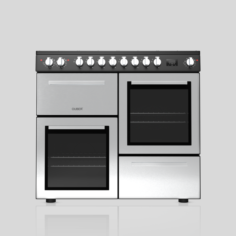 This freestanding oven is designed to deliver powerful performance, flexibility, and durability, making it ideal for large households or serious home cooks.  The hob features a sleek black painted cooktop and control panel, combining a modern look with practical functionality. It is equipped with 8 gas burners, including 2 rapid, 4 semi-rapid, and 2 auxiliary burners, allowing you to cook multiple dishes at different heat levels simultaneously. The high-quality SABAF burners come with built-in safety devices for added peace of mind, while the enamelled pan supports ensure stability and easy cleaning. Its single inlet gas pipe structure keeps installation simple and efficient.  The oven section stands out with four separate cavities, offering exceptional versatility. The upper left cavity is a compact 35L electric oven with two functions, perfect for smaller meals or quick cooking. The upper right and lower left cavities are both spacious 56L electric ovens with four functions each, giving you the flexibility to bake, roast, and grill multiple dishes at once. All oven interiors are finished with durable black enamel and feature double-layer glass doors for better heat retention and safety. Each cooking cavity includes a grilling rack and a universal tray for convenience. The lower right cavity serves as a practical storage compartment.  Additional features such as anti-slip feet provide stability, while the minimalist design—without a lifting handle on the cooktop—enhances its clean appearance. The unit also includes a power line without a plug, allowing for customized installation.  Overall, this freestanding oven is a powerful, multi-functional appliance that combines high capacity, safety, and modern design to meet all your cooking needs.