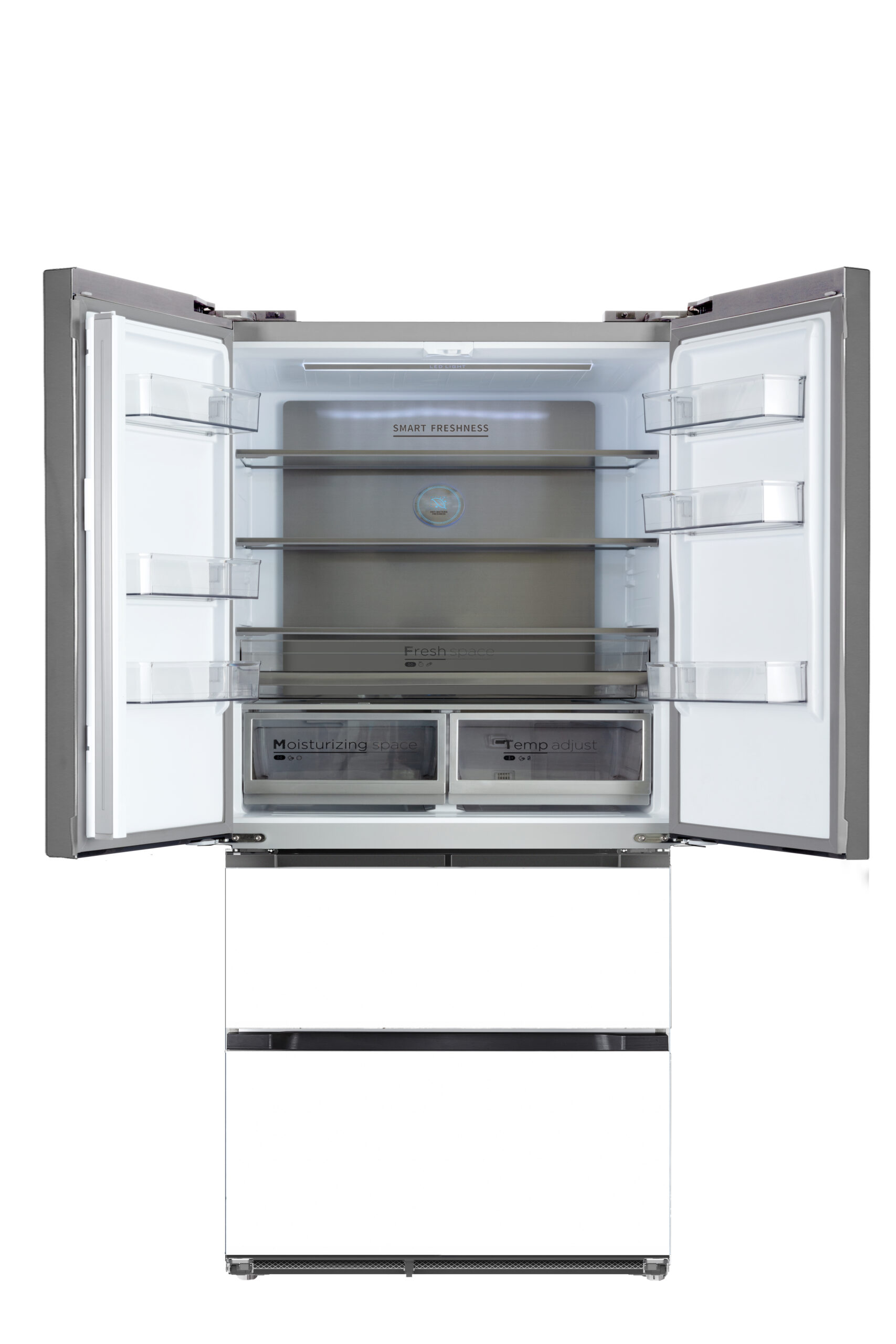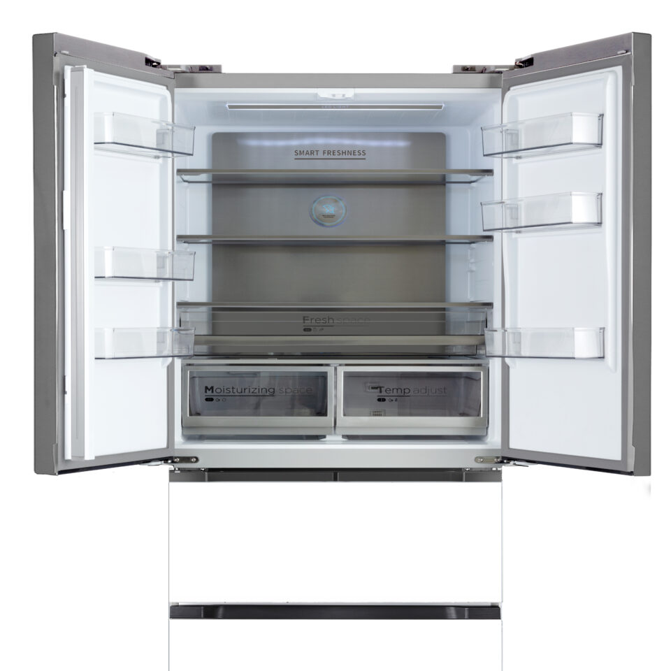 Experience refined cooling with this third-generation French door refrigerator, designed for seamless built-in integration. With its sleek slot-in design, it requires only 5 mm clearance on each side, creating a perfectly flush, modern kitchen look. Offering a spacious 521L capacity, it combines elegance with innovation—featuring active carbon technology to eliminate odors and Smart Freshness to reduce bacteria, keeping your food cleaner and fresher for longer. Finished with a minimalist white exterior, black recessed handle, and subtle silver accents, it delivers both style and advanced performance in one sophisticated appliance